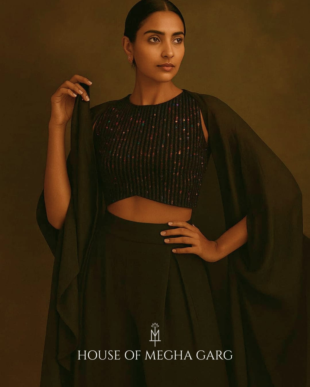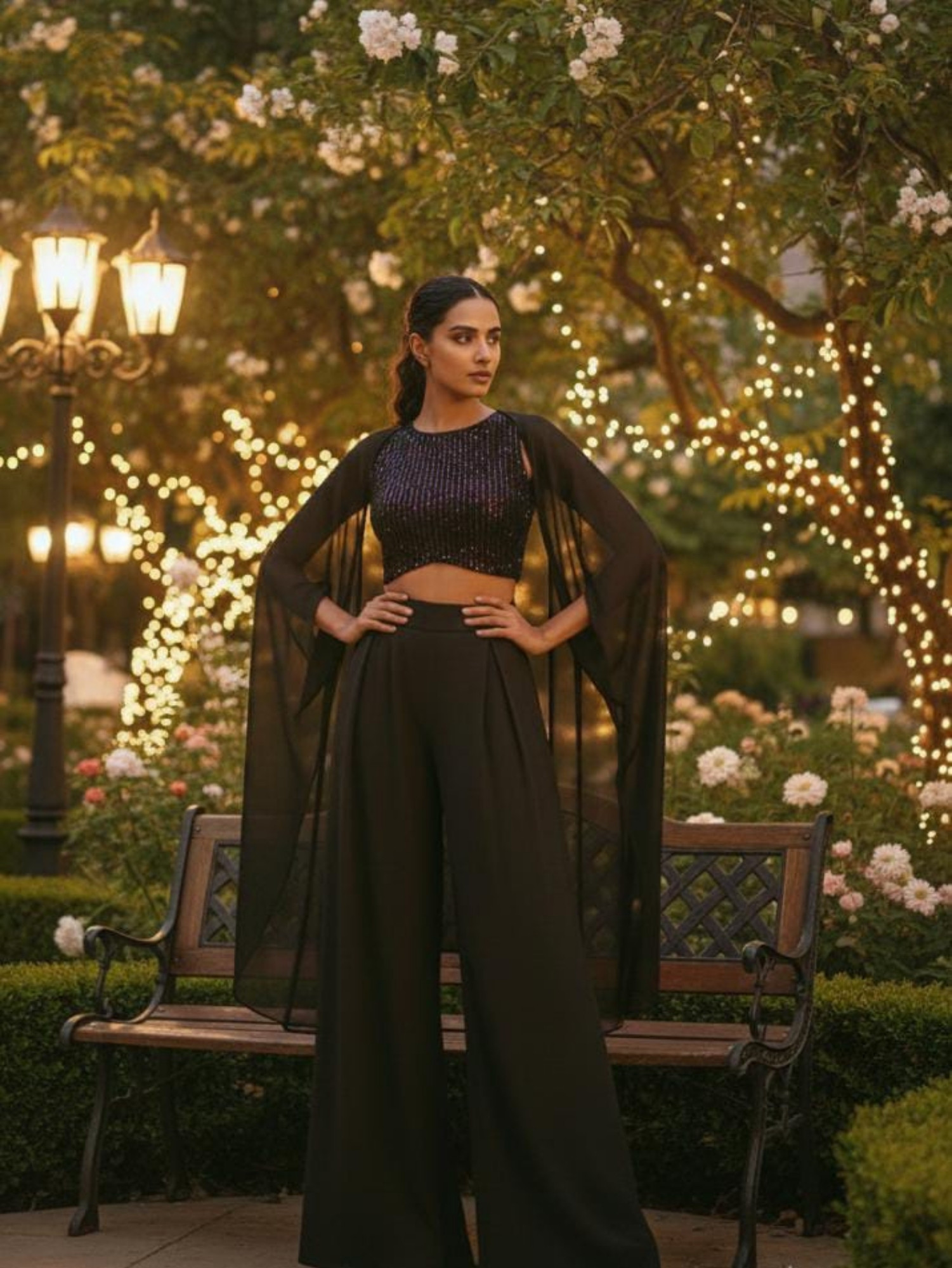 Step into timeless elegance with the Noir Aura Cape-Set, a seamless blend of sophistication and drama. The crop bustier is embellished with delicate sequins that shimmer subtly, creating an alluring contrast against the solid black base. Wide-leg pants add structure and movement, while the flowy drape overlay elevates the look with a touch of drama.