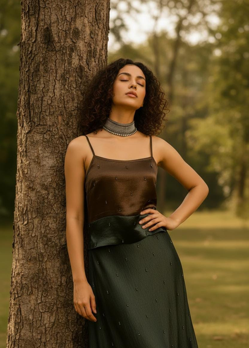 This embellished Satin Camisole Top is the epitome of understated glamour. Crafted in rich brown satin, it features slender spaghetti straps and a straight neckline, creating a sleek silhouette. Hand-embroidered bead motifs add subtle sparkle, making it versatile enough to style with skirts, trousers, or layered enough to style with skirts, trousers, or layered under jackets.