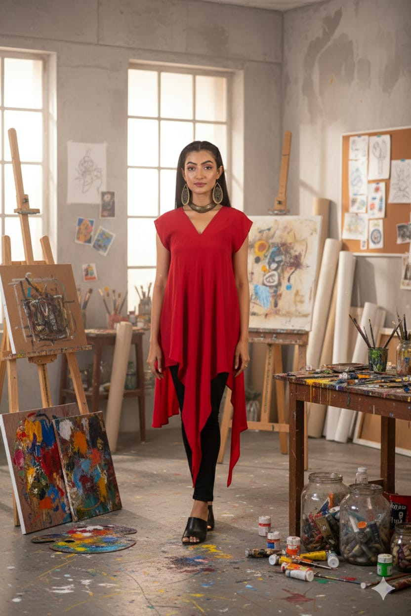 Crafted in lightweight crepe, this asymmetric tunic brings together elegance and boldness in one design. The deep red tone adds drama, while the handkerchief hemline creates a flowy, modern edge.