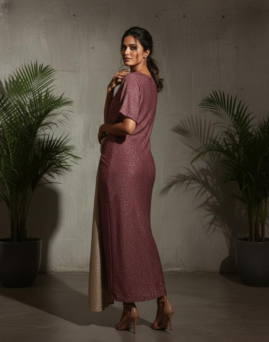 The Aurelia Two-Tone Draped Dress is a modern interpretation of sculptural draping. Designed in a rich dual-tone palette, the dress features a soft asymmetrical silhouette that flows seamlessly across the body.