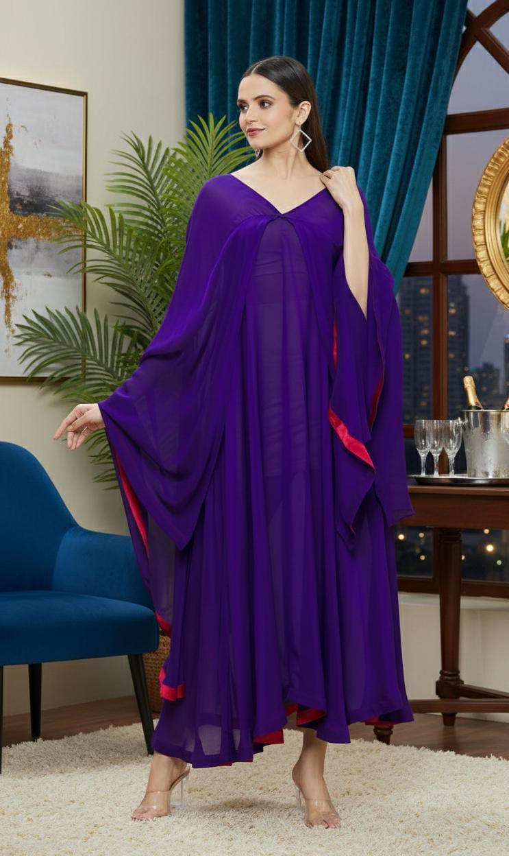 The Royal Violet Drape Dress is crafted to embody grace and fluidity. Rendered in a deep royal violet tone, the dress features sheer, layered draping that creates a light and airy silhouette while maintaining a rich, luxurious presence.