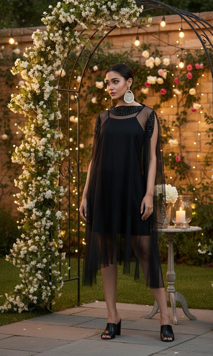 Dramatic yet effortlessly elegant-this black dress blends a straight cut inner slip dress with a soft mesh cape overlay that adds movement and dimension as you walk. The highlight of the piece is the hand-embellished neckline and sleeve panels, adorned with tiny sparkling beads and sequins arranged in a clean linear pattern, giving a subtle shine perfect for evening lights.