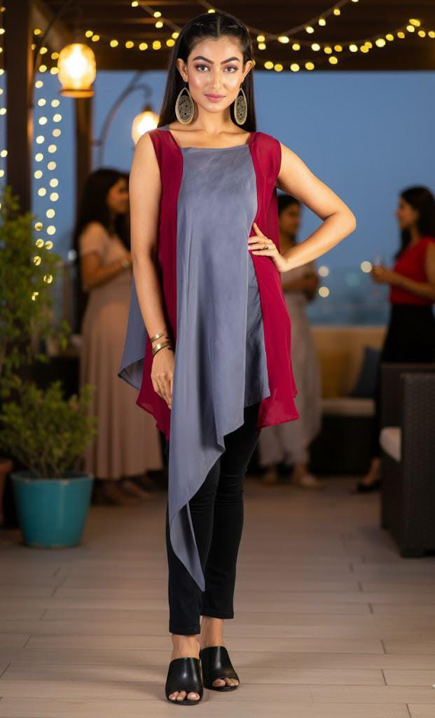 The Crimson Mist Asymmetric Tunic captures the beauty of contrasts- deep red meets soft grey in a free-flowing silhouette that flatters every body type. Designed with layered asymmetric panels, it brings a soft, graceful movement to your look.