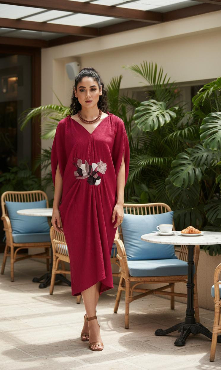 The Coral Red Pleated Dress is designed for understated elegance with a modern, fluid silhouette. Crafted in a soft, breathable fabric, this dress drapes beautifully, creating natural movement and a flattering fall.