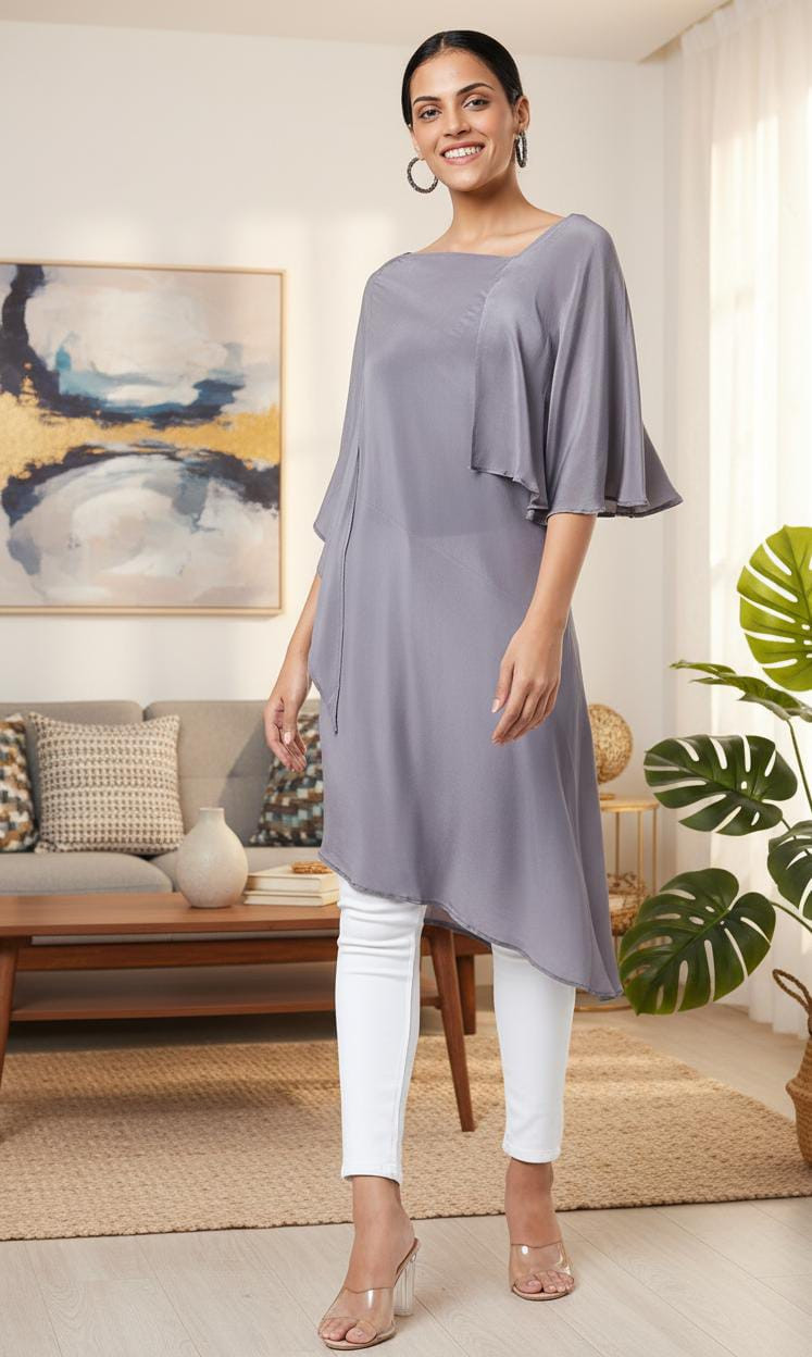Featuring a grey draped top in pure crepe base with wing sleeves.