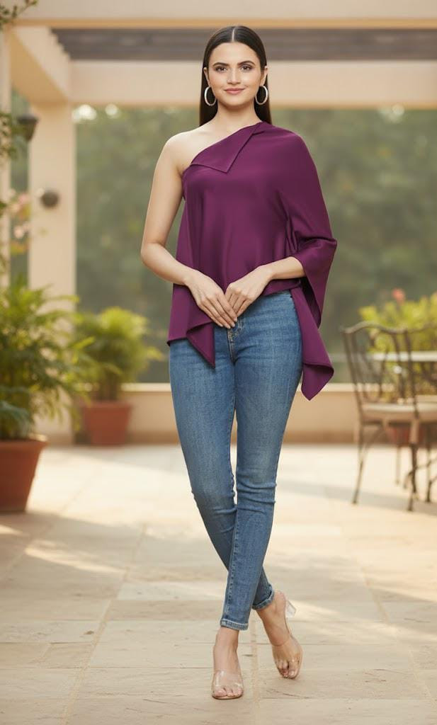 A contemporary take on minimal elegance, this purple scuba asymmetric top exudes sophistication with its one-shoulder silhouette and flowing drape. The rich jewel tone adds drama, while the clean cut enhances your natural shape. Pair it with denims for a casual glam look or tailored trousers.