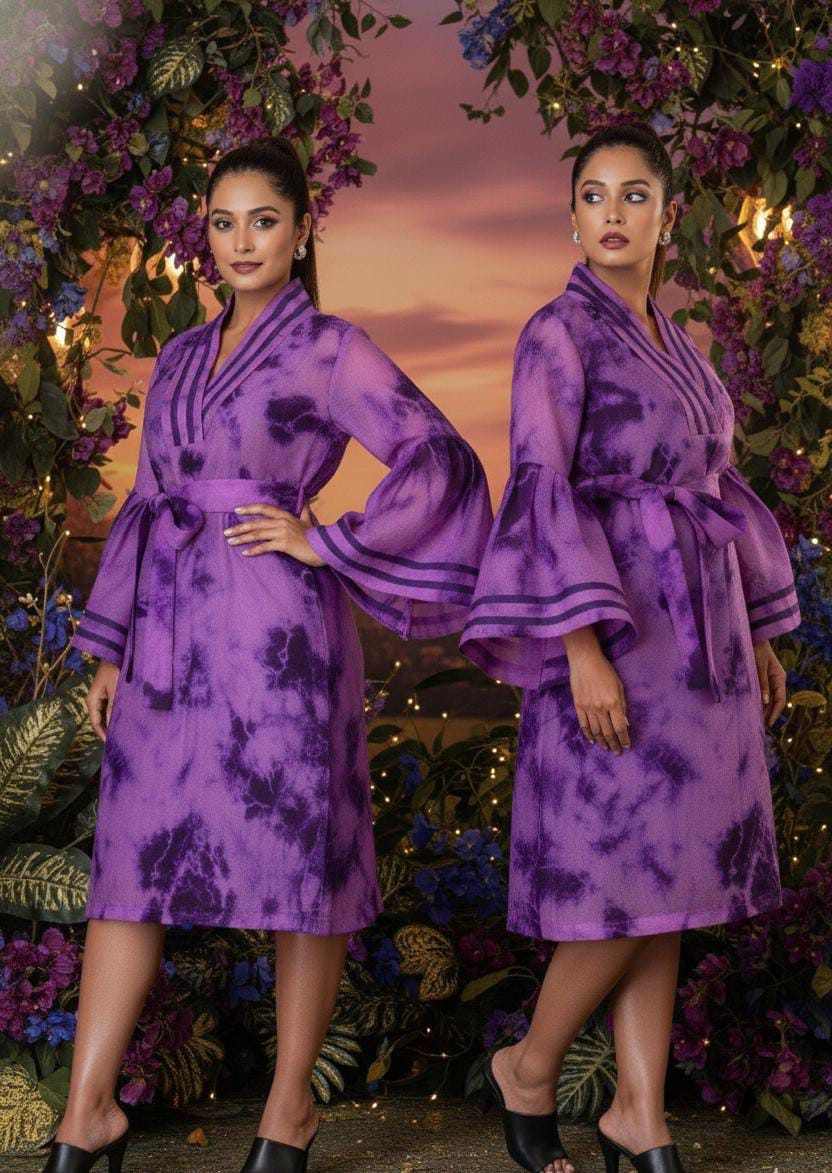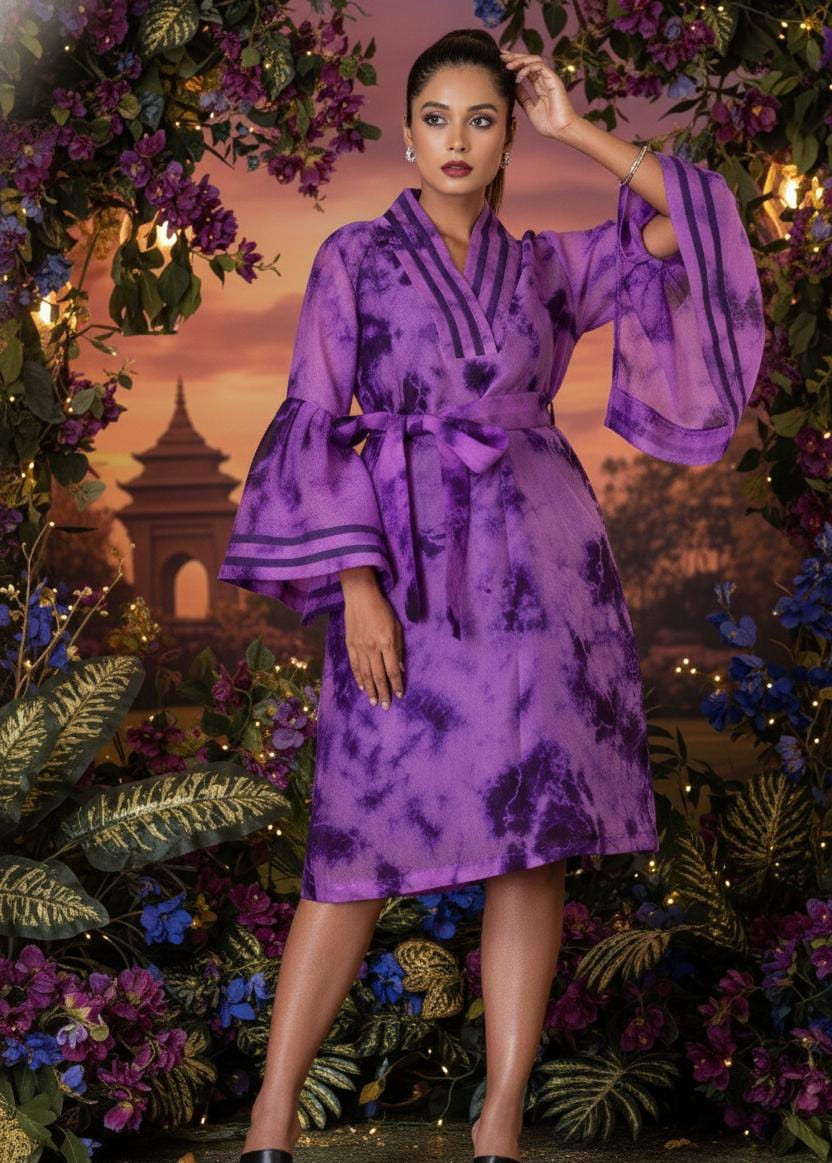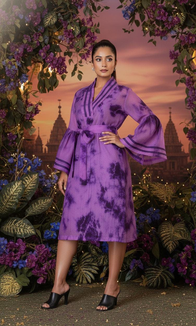 The Purple Tie-Dye Belted Dress brings together contemporary silhouettes and handcrafted aesthetics. Featuring a rich purple tie-dye pattern, this dress is elevated with voluminous belt sleeves and contrast stripe detailing that adds depth and movement.
