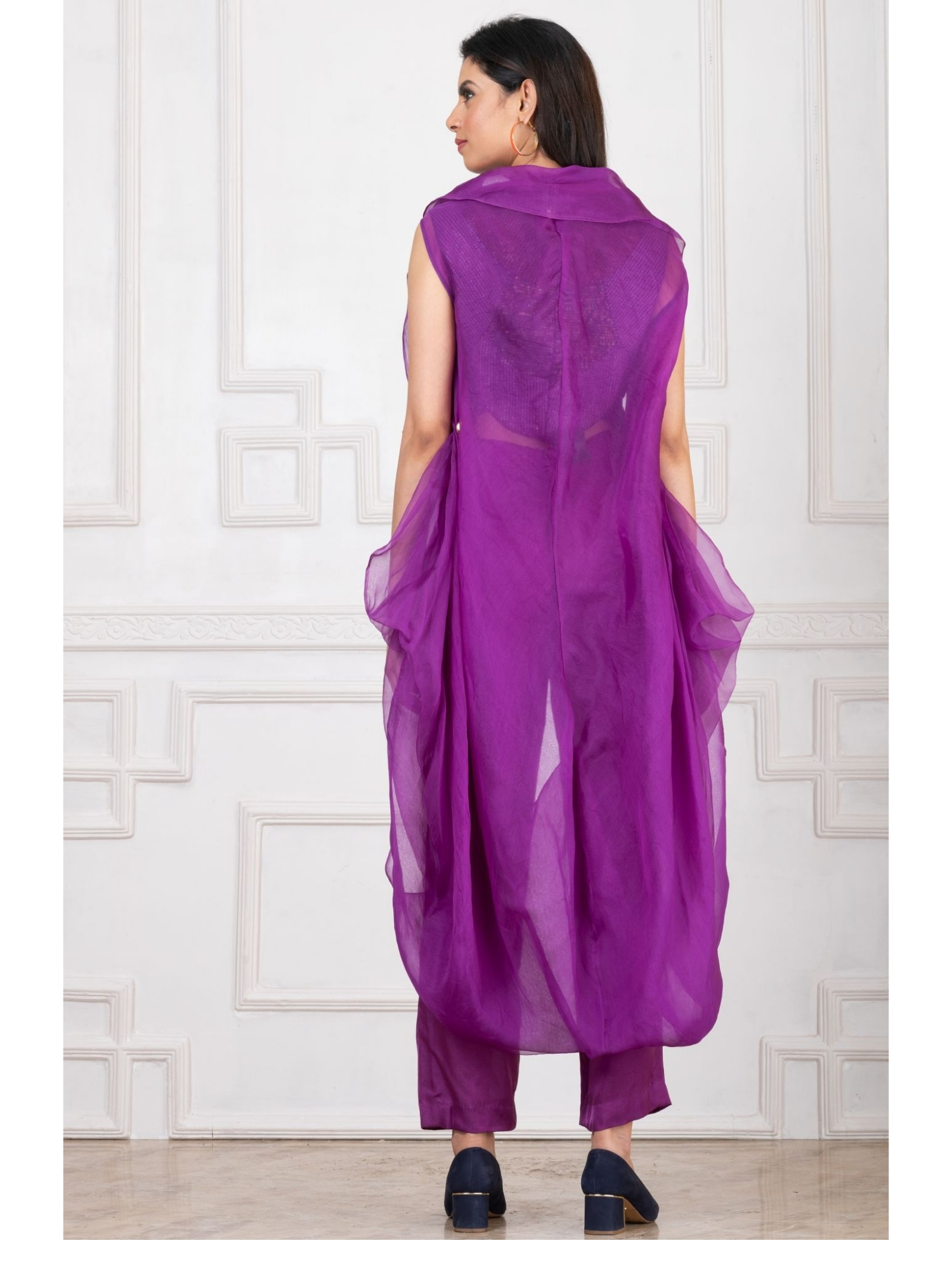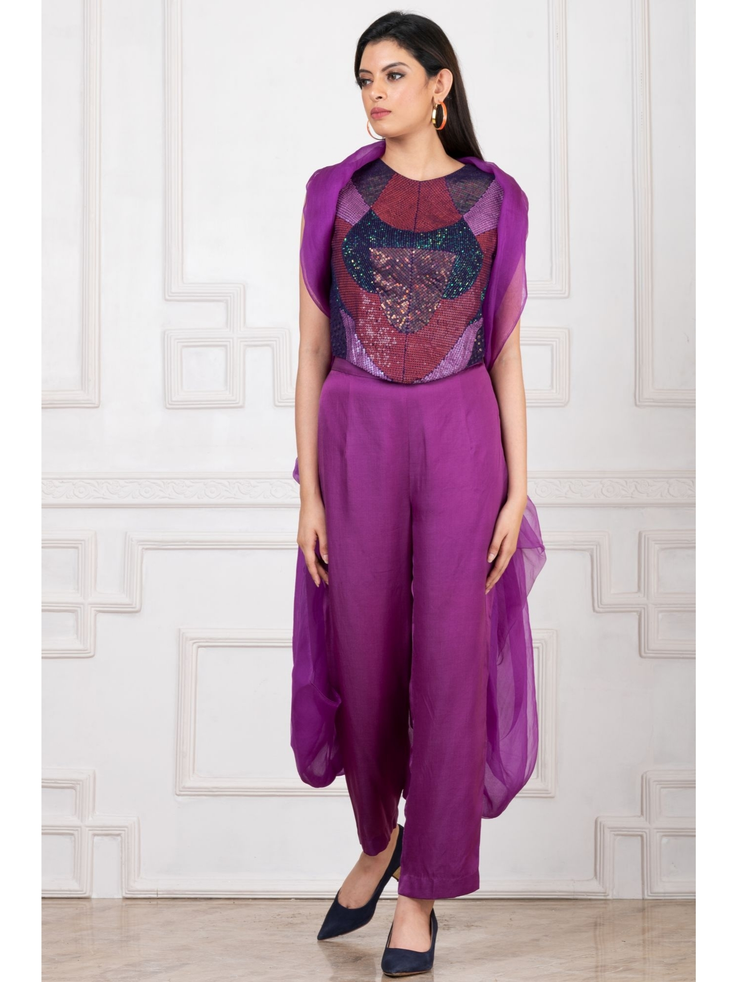 This vibrant orchid purple co-ord set is a head-turning ensemble designed for the modern woman. It features sleek tailored pants, a sequined top with geometric embellishment, and a lightweight pleated Cape that adds movement and drama. While the layered silhouette brings depth and flair.