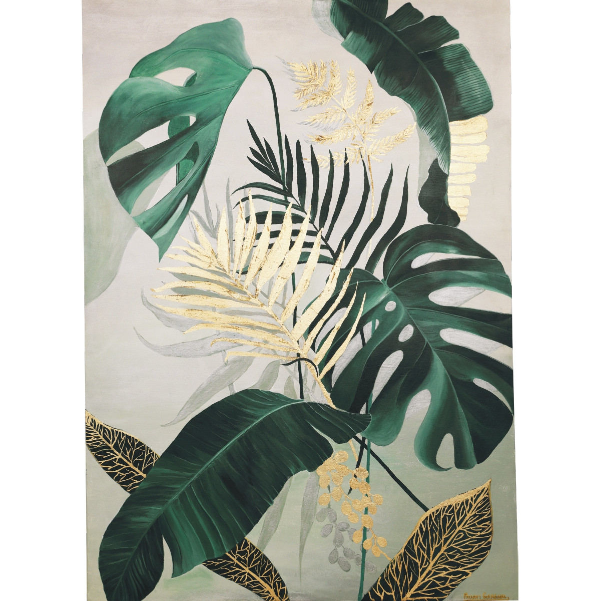 The painting features a few meticulously painted leaves that closely resemble their original counterparts. Adding a touch of gold leafing to the artwork bestowed it with a radiant and sophisticated appearance. The highlight of this composition was the skillful depiction of the light source and the accompanying shadows beneath the leaves.