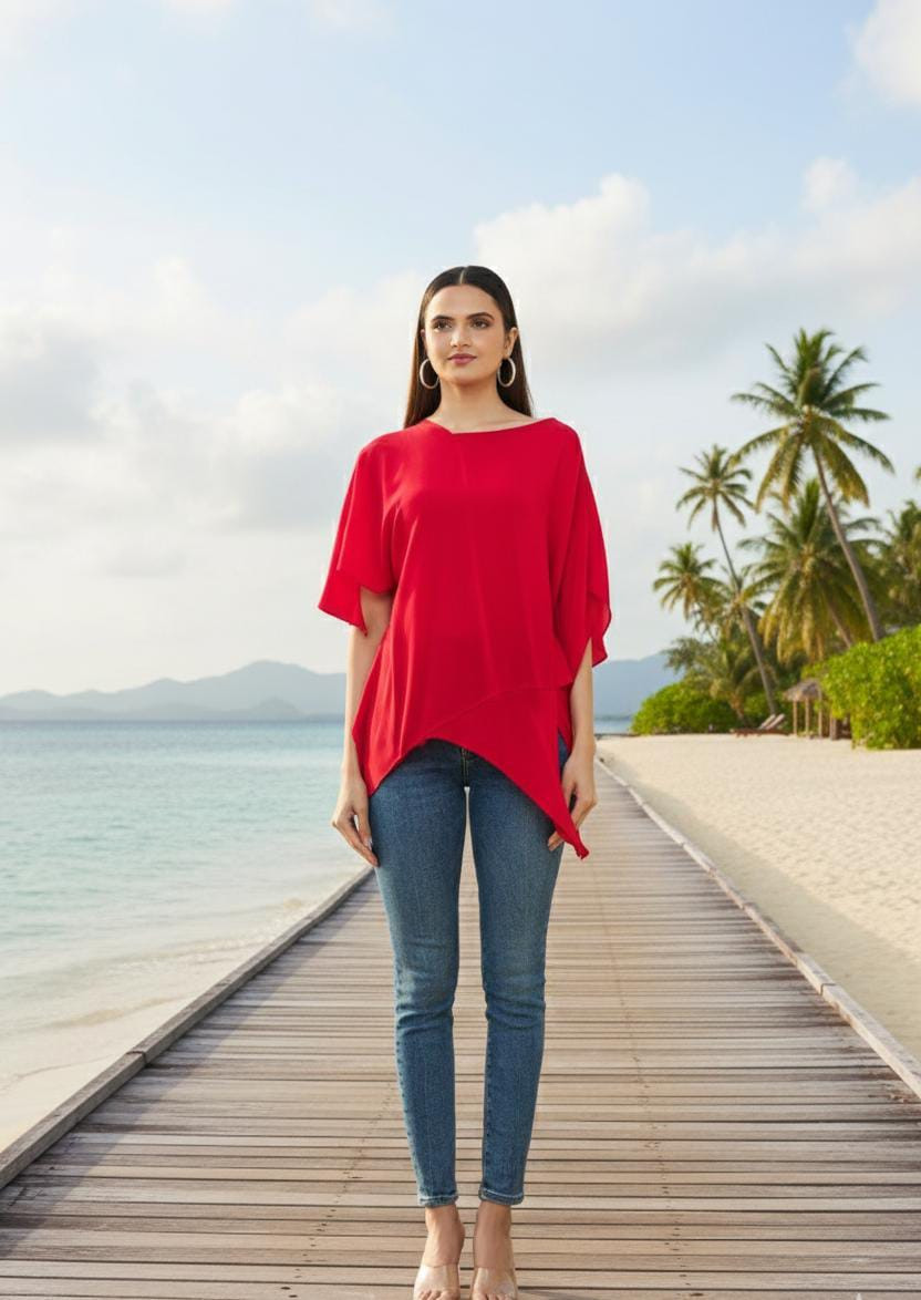 The Red Crepe Draped Top is a statement piece that radiates confidence and charm. Crafted in rich, flowy crepe, it features an asymmetrical hemline and fluid drape that flatters all body types. The relaxed short sleeves and boat neckline give it a sophisticated touch, while the bold red hue ensures you stand out effortlessly.