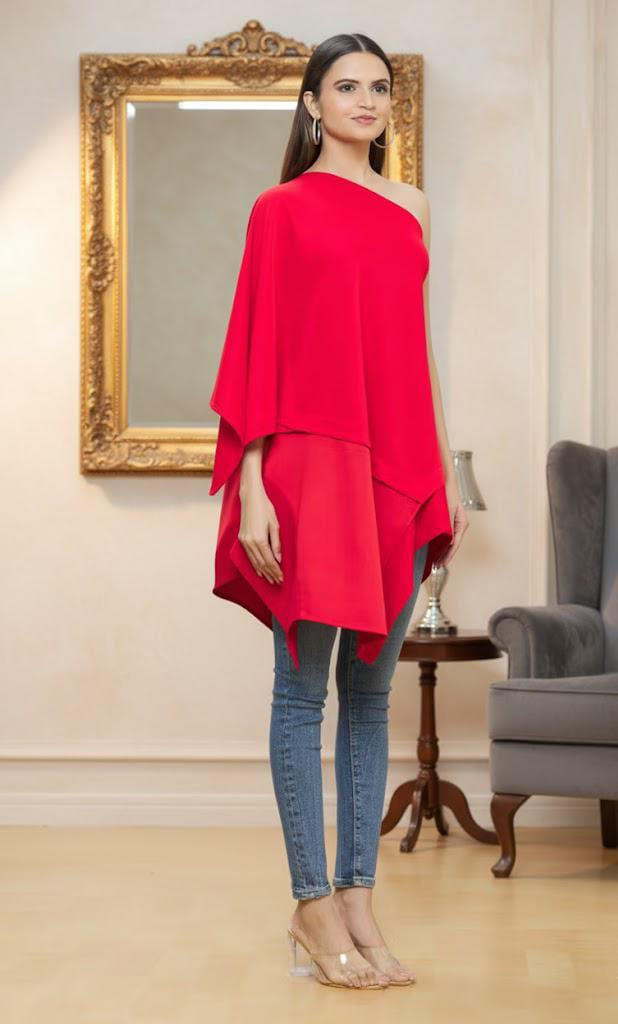 Red Scuba Asymmetric One Shoulder Draped Tunic Top