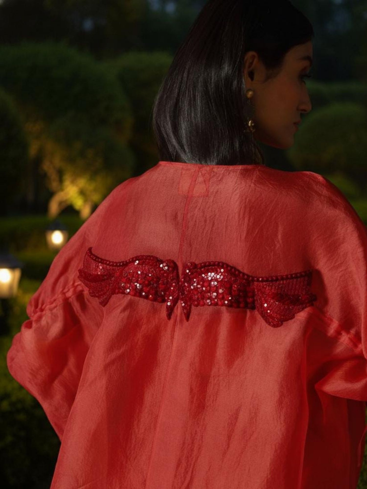 This stunning red Co-ord set celebrates the power of simplicity elevated with detail. The structured busier offers a clean, flattering fir, paired with a draped skirt that flows with grace and ease- perfect for movement and style. The lightweight organza jacket, finished with intricate sequin work at the back, adds a touch of shimmer and sophistication.