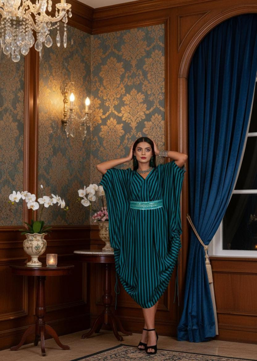 The Emerald Stripe Dress is designed for women who love comfort without compromising on style. Crafted in a lightweight, flowy fabric, this dress features bold vertical stripes that elongate the silhouette and create a striking visual rhythm.