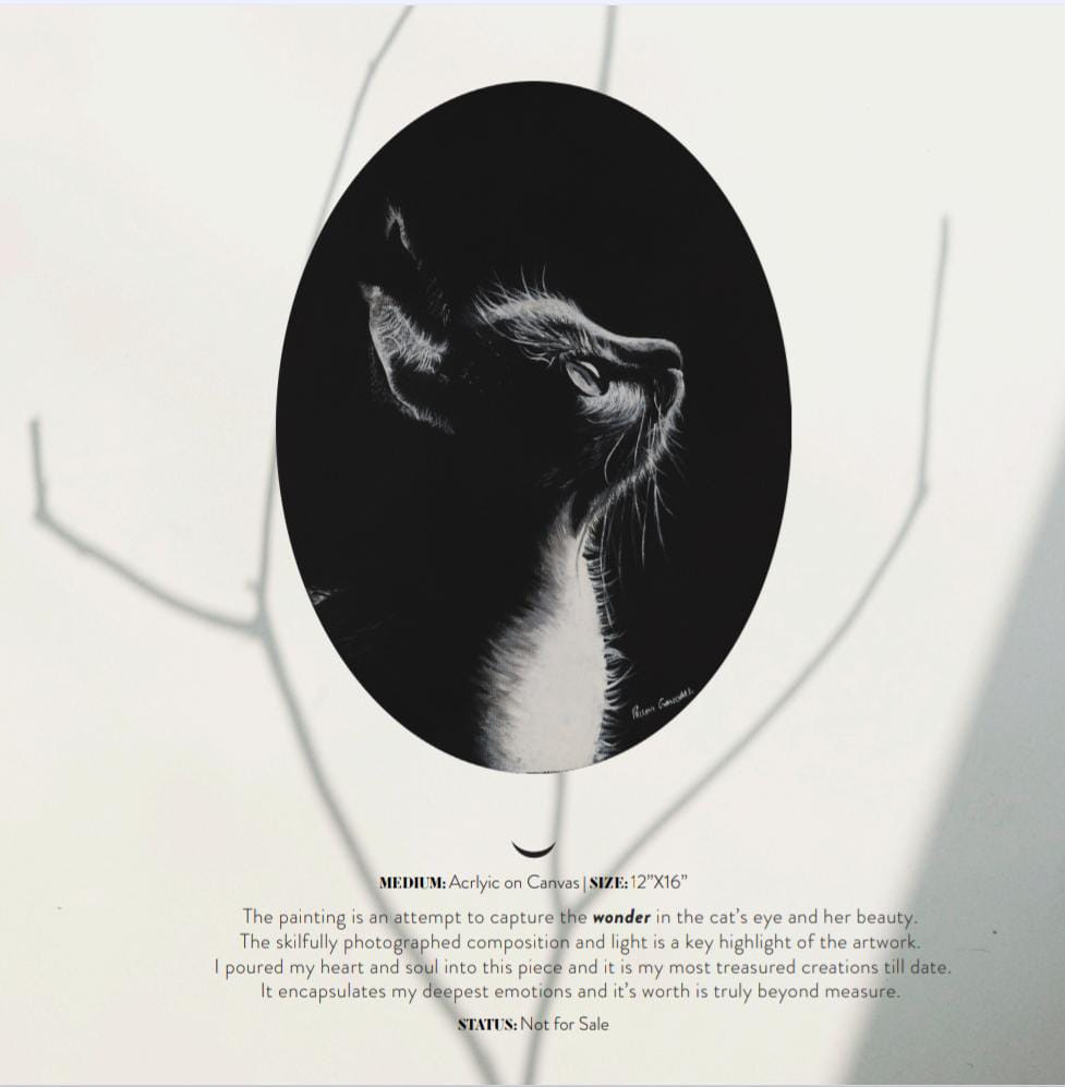 The painting is an attempt to capture the wonder in the cat’s eye and her beauty. The skillfully photographed composition and light is a key highlight of the artwork. I poured my heart and soul into this piece and it is my most treasured creations till date. It encapsulates my deepest emotions and it’s worth is truly beyond measure.